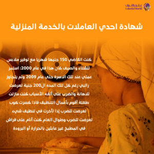 اما علا أحمد والتي عملت بمجال الخدمة المنزلية لمدة تجاوزت العشر سنوات فتروي لنا ما حدث معها قائلة ” بدأت العمل في سن 13 عملت لدي اسرة معروفة كان يعمل لديها والدي بمحافظة الإسكندرية كنت اتقاضي 150 جنيها شهريا مع توفير ملابس للشتاء والصيف كان هذا في عام 2000؛ استمر عملي عند تلك الاسرة حتى عام 2009 ولم يتجاوز راتبي رغم كل تلك المده ال200 جنية تعرضت للاهانة والضرب على أتفه الأسباب كنت مازلت طفلة أقوم بأعمال التنظيف فاذا كسرت كوب تعرضت للضرب إذا تأخرت في تنظيف شيء تعرضت للضرب وطوال العام كنت أنام على فراش في المطبخ غير عابئين بالحرارة أو البرودة التي قد تأكل جسد طفلة ولم يهتم أصحاب العمل بتوفير أي كماليات قد تساعدني او تسهل علي العمل حينها